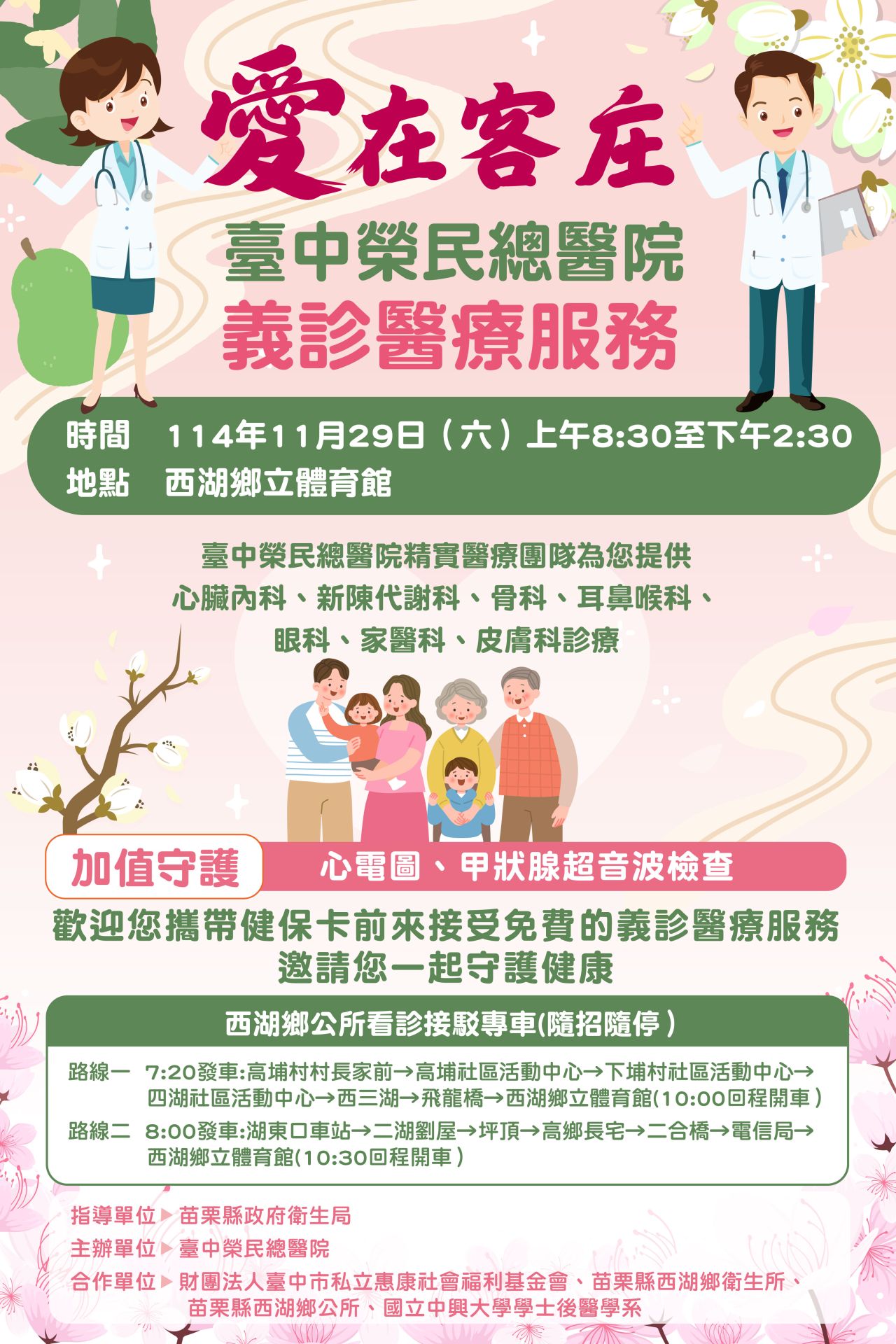 歲末時節送暖到客庄。臺中榮民總醫院114年11月29日前進苗栗縣西湖鄉,在西湖鄉立體育館辦理「愛在客庄」大型義診活動,由院長傅雲慶親自領軍,攜手苗栗縣衛生局與院內醫護、藥事與遠距醫療團隊,共動員約80名專業人員,從零開始迅速搭建臨時醫療站,打造如同醫院等級的就醫流程,守護偏鄉居民健康。