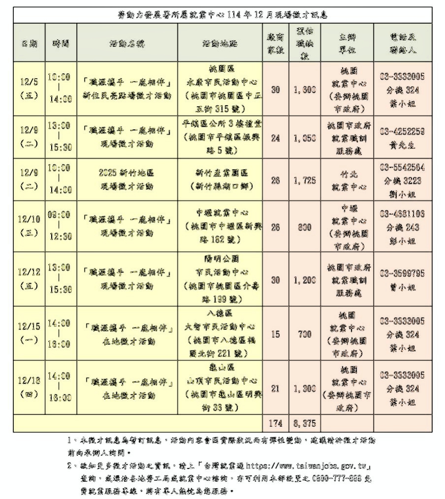 ▲桃竹苗分署將於12月份辦理7場徵才活動,邀集174家企業、釋出8,375個職缺,歡迎有興趣的求職者踴躍參與。(圖/桃竹苗分署提供)