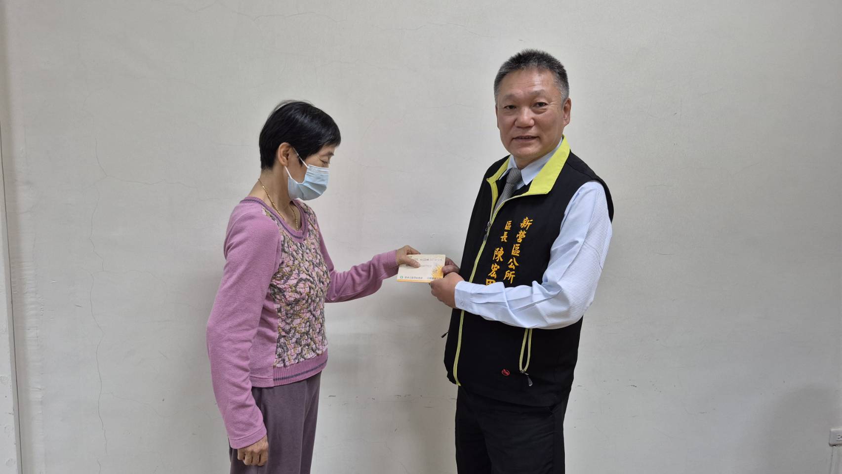 ▲新營區長陳宏田代表中央發給丹娜絲颱風及七二八豪雨影響的災民兩萬元補助金。(新營區公所 提供)