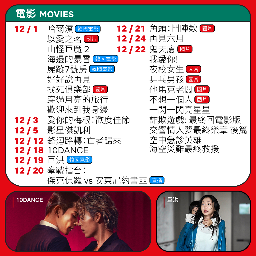 Netflix也同步公布完整的12月上架片單(含電影與影集),從驚悚、戀愛、懸疑到動作一應俱全,被網友形容「12月片荒?Netflix不准你說這句話」。