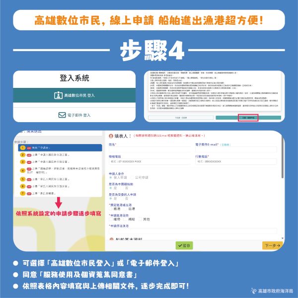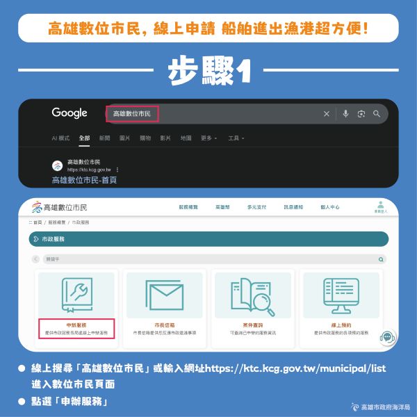 海洋局呼籲,凡屬漁船以外之船舶,進出本市各港口時,請優先透過「高雄數位市民網站」(https://ktc.kcg.gov.tw)路徑:市政服務/申辦服務/機關單位/海洋局/高雄市政府海洋局轄(代)管各漁港漁船以外船舶進出漁港申請,辦理線上申請,共同落實漁港管理數位化,攜手打造高效、便利的漁港環境。
