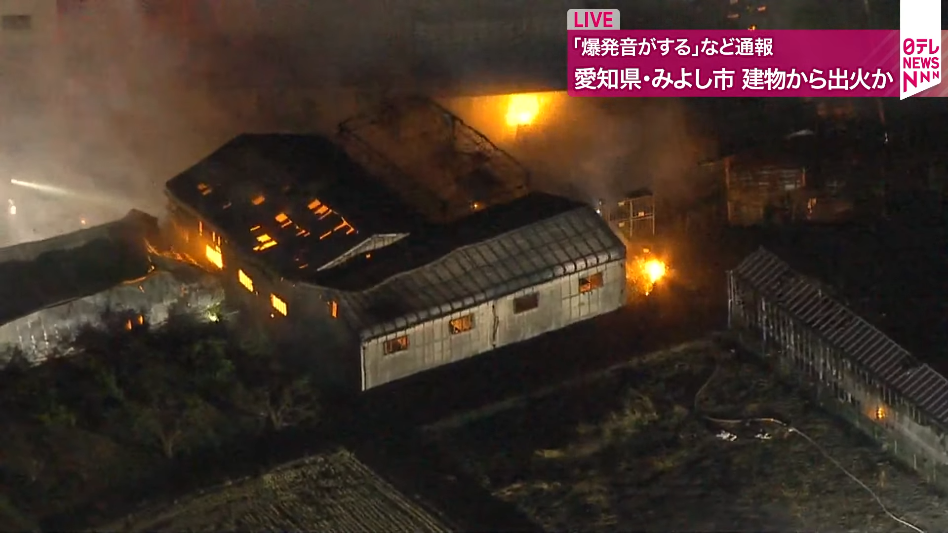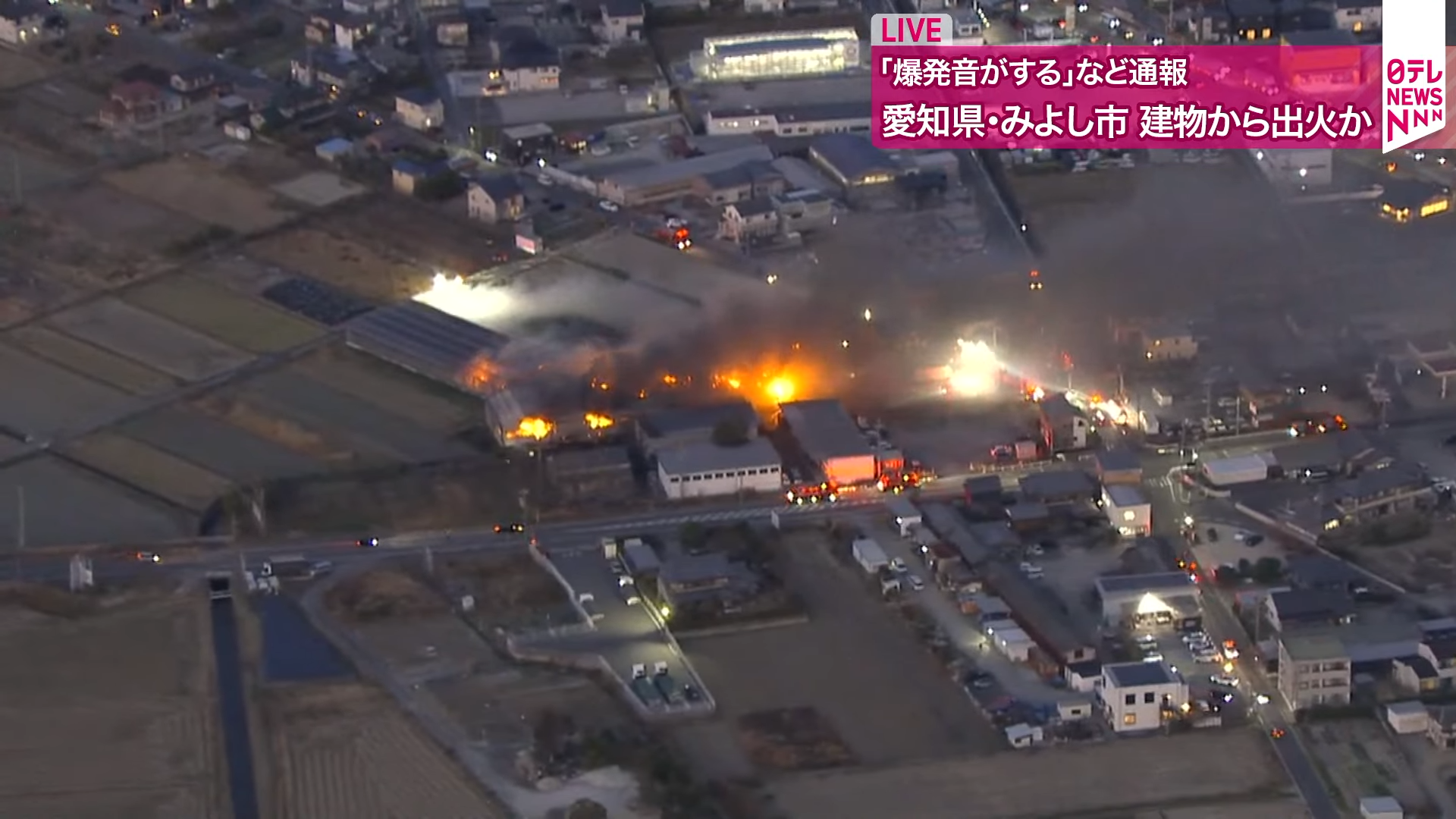 ▲愛知三好市倉庫大火!園藝用品公司冒黑煙狂竄...大面積燃燒 消防布水線灌救(圖/翻攝自 YouTube/日テレNEWS)