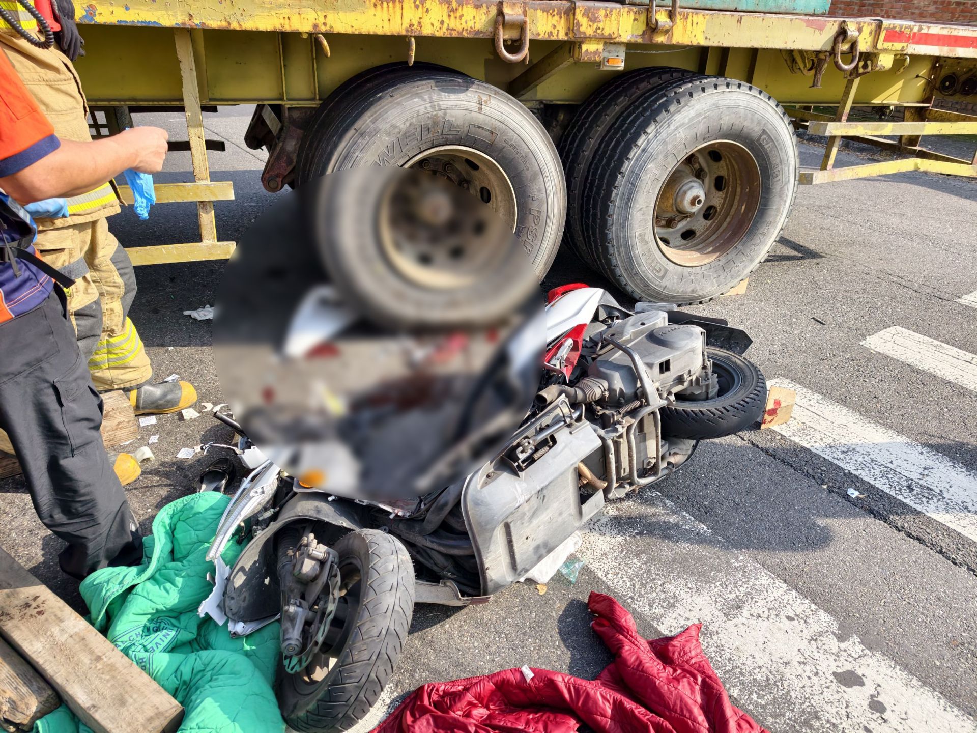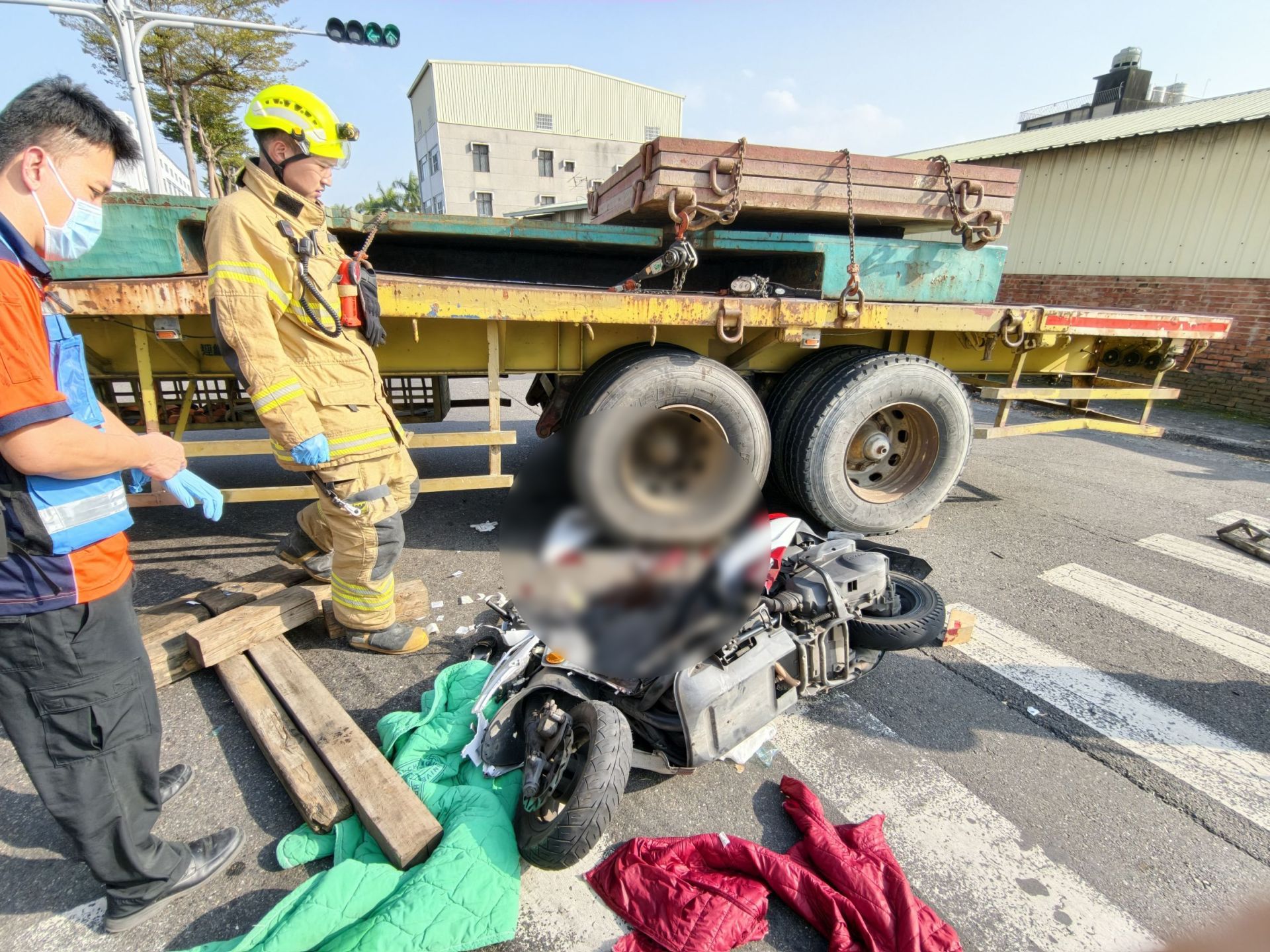 ▲台南驚悚車禍!拖板車輾壓機車「女騎士右腿卡輪下」 警消急搶救送醫(圖/記者王俊勝 翻攝)