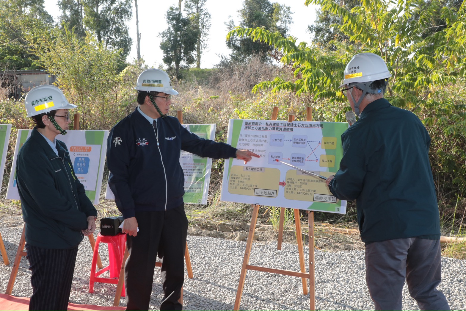 因應內政部國土管理署115年全面實施「營建剩餘土石方全流向」管理新制,台南市政府積極推動建築工程土方交換政策,成功促成永康區台糖建案工程與衛生福利部嘉南療養院安定院區長照機構新建工程媒合,將民間建案產出的剩餘土石方直接轉作公共工程回填使用,不僅紓解土方去化壓力、節省公帑,也加速長照建設推進,展現資源循環利用成效。市長黃偉哲昨(10)日與副市長趙卿惠前往視察土方交換作業,肯定工務局在多元土石方去化上的努力。