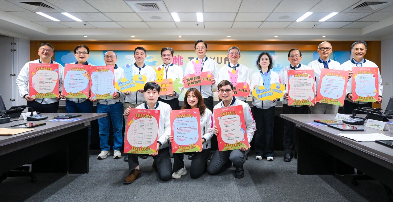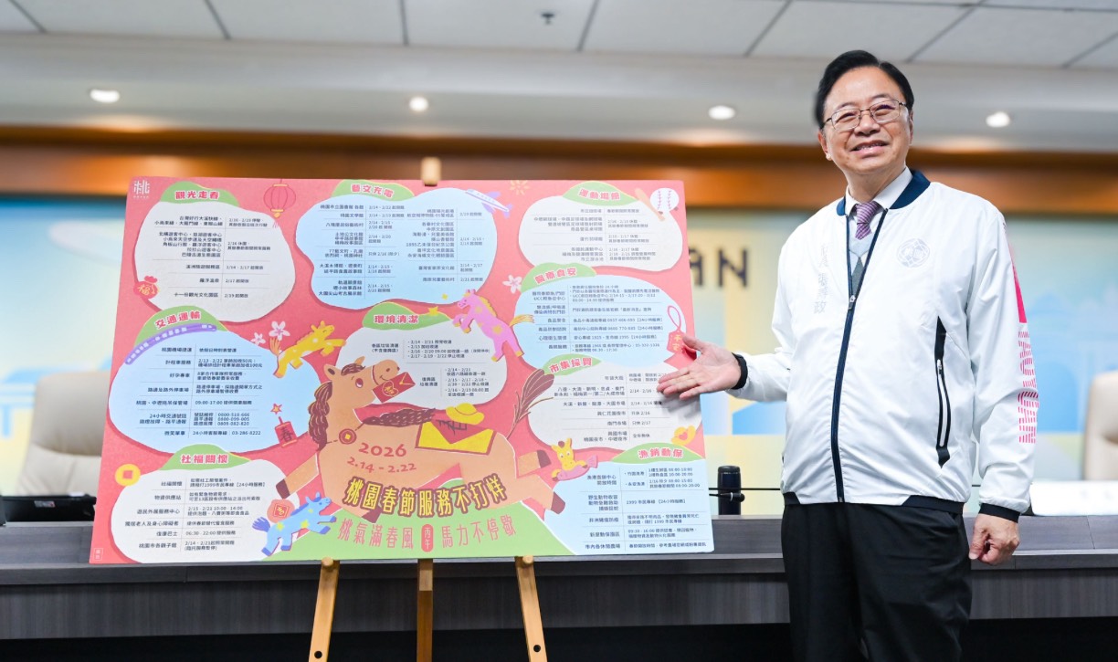 【視傳媒記者袁慧心/桃園報導】桃園市長張善政今(11)日上午於市政會議前,率領局處首長宣布桃市府「115年春節服務不打烊」措施。張市長表示,今(115)年農曆春節假期自2月14日至22日,為期9天,市府整合環境清潔、藝文充電、觀光走春、運動場館、交通運輸、漁銷動保、醫療食安、社福關懷及市集採買等九大不打烊暖心措施,確保春節期間市政服務不中斷,陪伴市民朋友安心歡度新春。