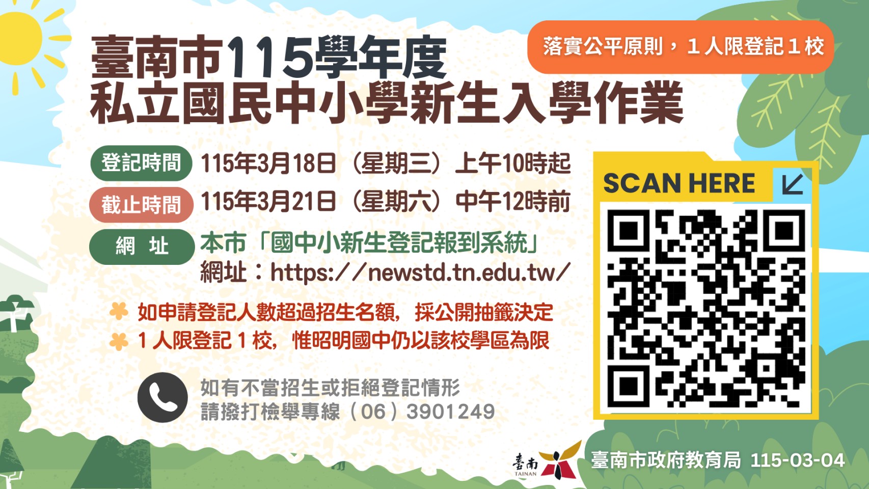 教育局重申,如果有不當招生或拒絕登記的情形,請家長立即撥打檢舉專線(06-3901249)反映,教育局會立即派員瞭解及處理,以保障每位學生權益,入學詳細期程可至新生登記報到系統下載參閱。
