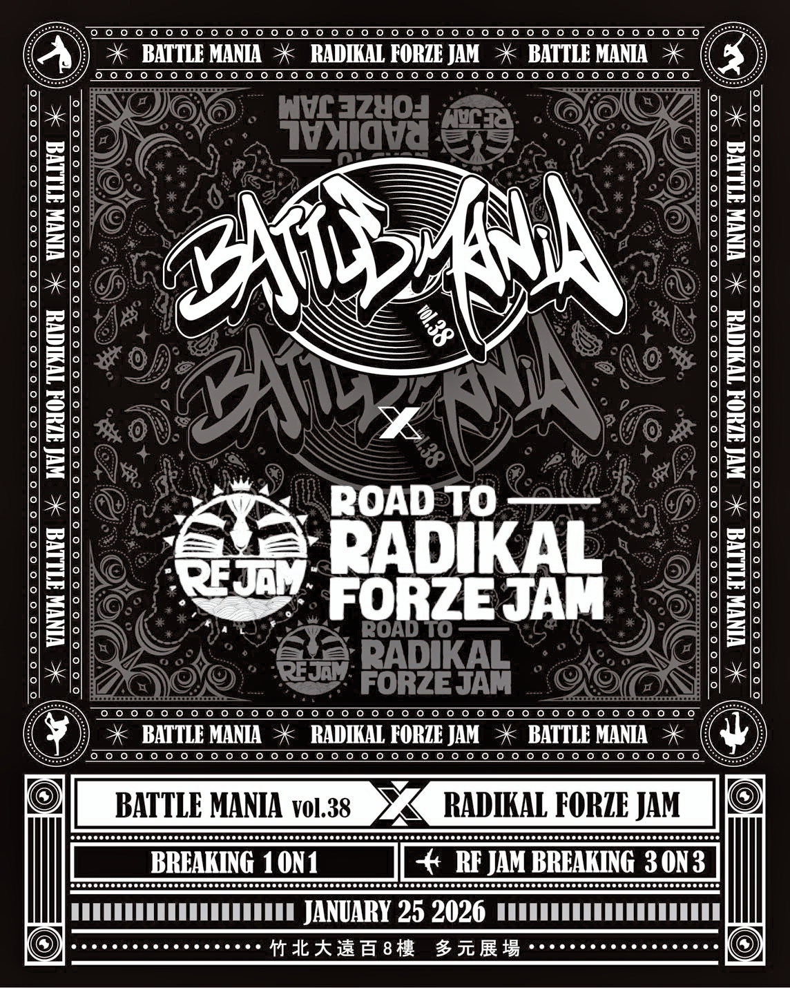 yoo 街舞狂熱又來了!2026年第一個月帶給大家熱血的第38屆街舞狂熱(Battle Mania.38)活動,將於1月25日舉辦在竹北遠百8樓的多元展場,高品質的場地將帶來全新的震撼氛圍。這場街舞活動結合2026 Radikal Forze Jam(RF JAM )國際街舞台灣區域賽,冠軍將於2026年3月14號代表台灣前往越南峴港市參戰,與中國、泰國、馬來西亞、俄羅斯、韓國、新加坡、越南、日本等 一爭高下!歡迎大家一起共襄盛舉這場全國人氣街舞盛會!